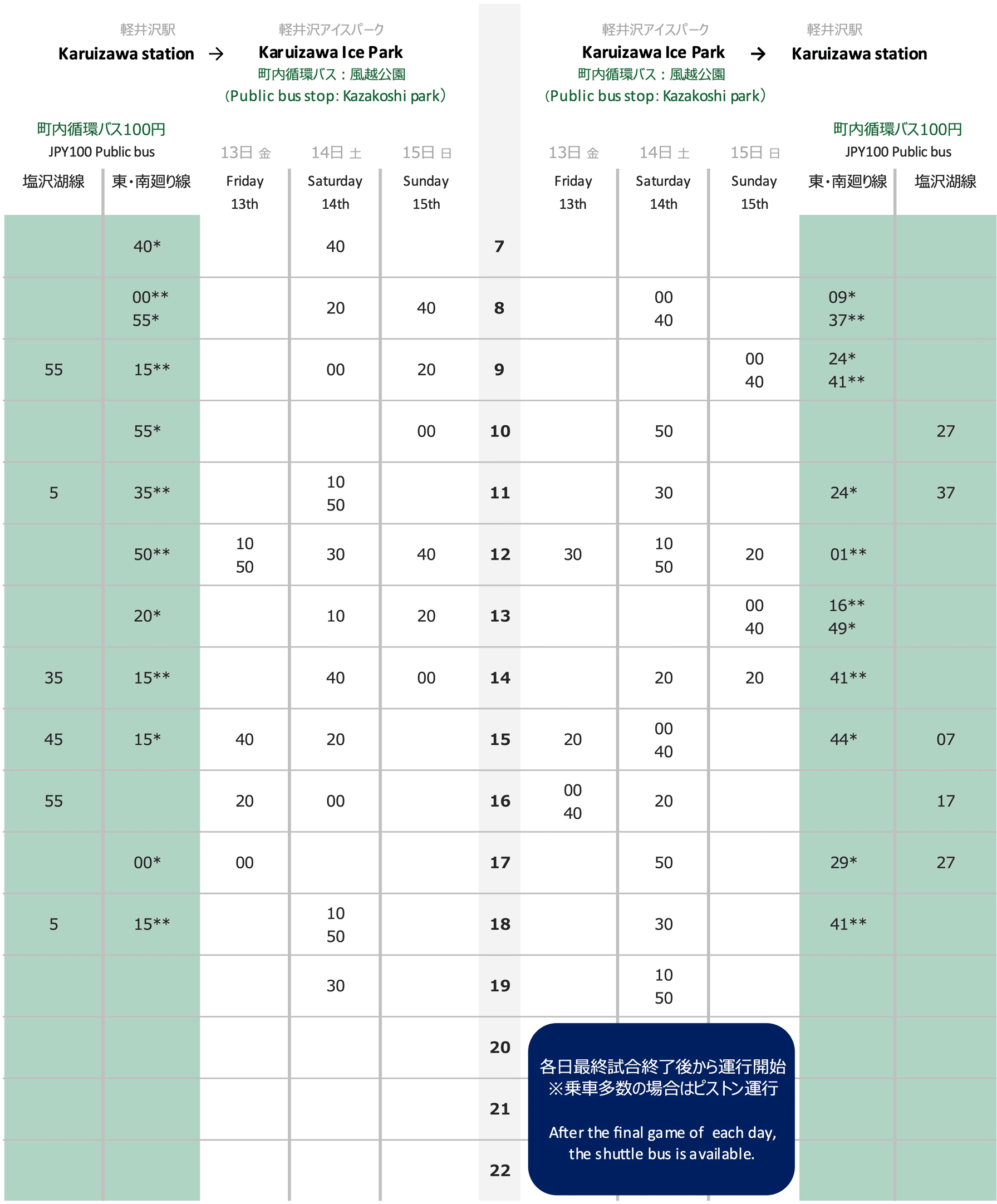 大会期間中のみ専用シャトルバスが軽井沢駅~軽井沢アイスパーク間を運行します